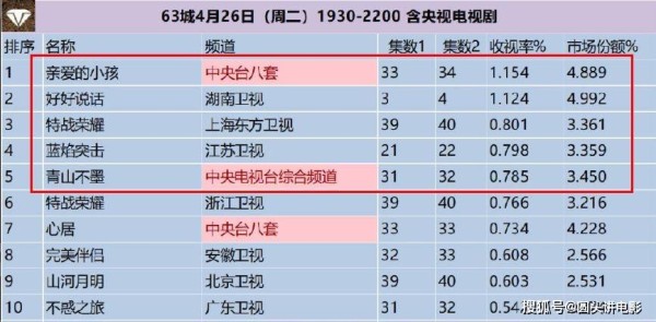 从“63城”4月26日晚热播电视剧收视率排行榜数据显示可知,当前热播电视剧收视率榜Top5分别如下: