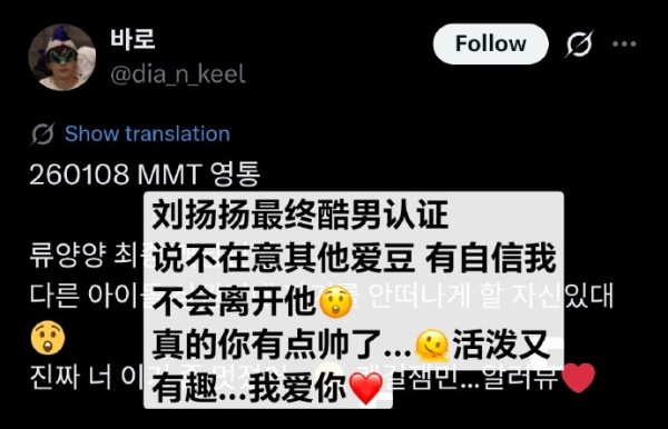 260108 mmt线上签售持续散发自信美迷倒欧尼中:纳尼?等一下..我认识的人?不是,真是你男朋友还是你喜欢的爱豆?:爱豆,怎么会是真男朋友:啊那就跟我没啥关系了。:噢~很酷哦~:我有自信:真的吗?什么样的自信?:姐姐不会离开我,有那样的自信。:真的吗?哇~这句话有点感动哦,谢谢你扬扬~:所以对于这种我不在意:真的啊,今天有点帅哦你:是吧,今天是不是跟我的衣服一样帅cr dia_n_keel资源/翻译 瓶子#刘扬扬威神v唯一主rapper# lyy@威神V_扬扬_YANGYANG ——————————应援棒内饰⌨️蓝牙键盘鼠标补U贴纸书补U coco加餐计划♀招新