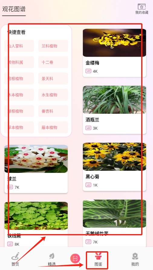 3、想辨认花草,直接找图鉴板块,各种植物图片和介绍都在这儿,特别方便。