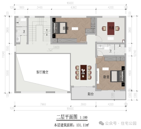 二层层高3.3米,挑空高度6.9米,设置双卧室,满足居住要求。