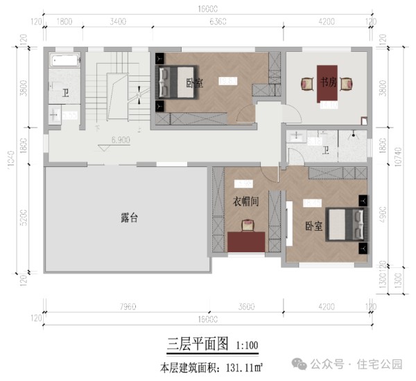 三层层高3.3米,还是双卧一书房一公卫的配置,但相较二层空间,新增了衣帽间跟观景露台,更实用,更方便。