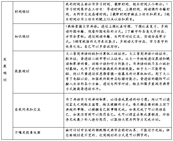 【二】规划:说实话,对于规划二字,我一时摸不着头脑,它不等同于理想,不与计划并列。想起自己走过岁月中的点点滴滴,我不禁有些惭愧。我对自己以往在学业、文体、社团活动中的表现不是很满意。我发现我自己惰性较大,平日里总有些倦怠、懒散,学习、做事精力不够集中,效率不高,态度也不够专注。倘若不改正,这很可能会导致我最终庸碌无为。不过还好,我还有改进的机会。否则,岂不遗憾终生?