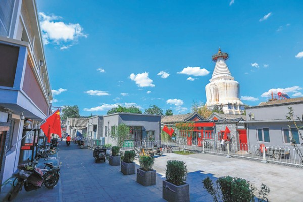 盛夏午后,站在宫门口东西岔胡同的中心广场向东望,巍峨白塔,向西望,市井人家。北京日报记者 潘之望摄 “咔哒”一声落了锁,内务部街“新居民”牛瑞雪将车停放在上个月刚建成的胡同立体停车场内,没走几步就来到27号朝阳门社区文化生活馆门口。“牛牛,你们周末在胡同里搞的读书活动挺热闹啊!”胡同居民热情地招呼。社区文化生活馆主理人牛瑞雪乐了:“喜欢您常来。”