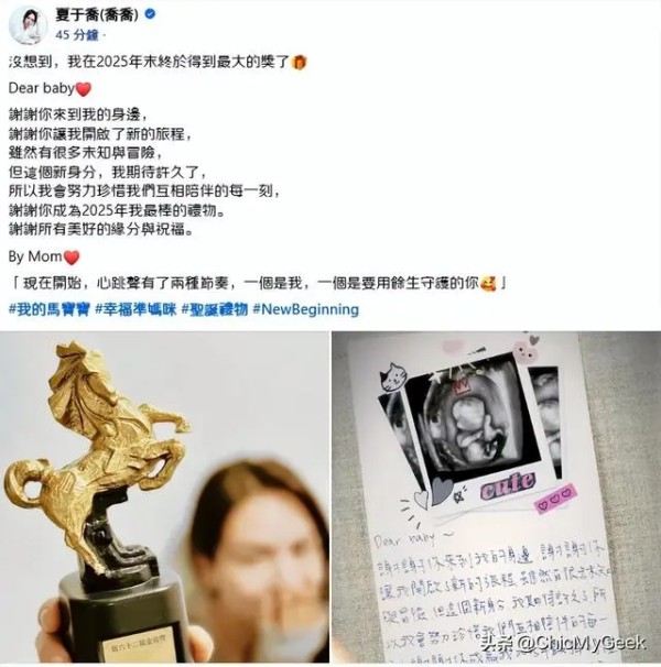 她手持「最佳准妈咪」奖杯,感性写下:「没想到,我在2025年末,终于拿到了人生中最大的奖。谢谢你来到我的身边,谢谢你为我开启一段全新的旅程。」