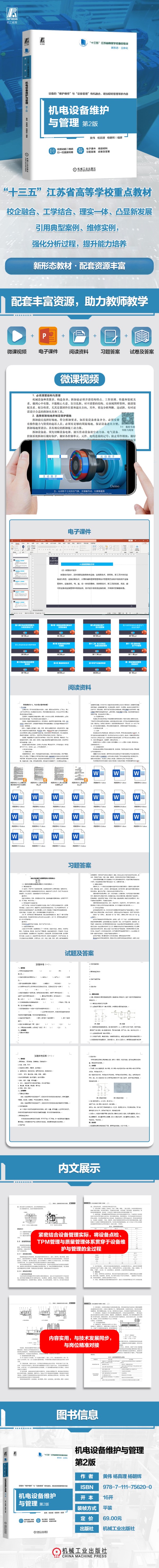 本书是“十三五”江苏省高等学校重点教材,在保持上一版特点与结构的基础上,进行了修订。全书分上、下篇,上篇为机电设备维护维修,下篇为机电设备现场管理。上篇包括设备维修管理基础知识、设备的故障诊断技术及预防维修、设备维修的拆卸与装配、典型的修复技术、电气设备的维修、常用高低压成套电气设备的维护、起重设备的维护;下篇包括机电设备管理要求、内容及基础工作,设备的资产及价值管理、设备的现场管理与检修、设备点检及TPM管理、动力设备及起重设备的管理。本书紧密结合设备管理实际,与社会发展同步,内容实用,与岗位精准对接。 本书可作为高等职业院校电气类专业、机电类专业及其他相近专业的教材,也可作为应用型本科院校和职业本科院校相应专业的教材,并可供从事企业设备维护与管理的工程技术人员参考。
