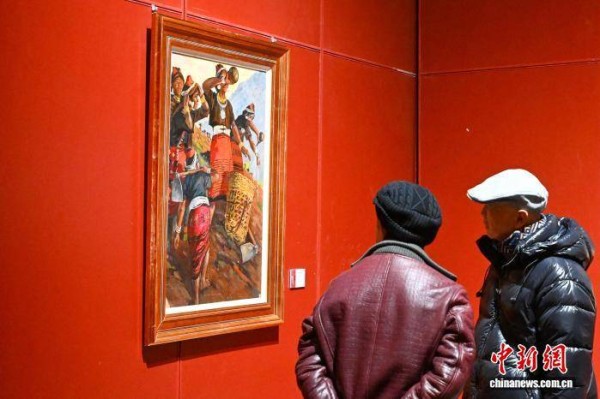 1月9日,云南昆明,观众观看展品《阿佤山上收工时》。当日,“归乡——清华大学美术学院谷嶙教授作品捐赠展”在云南美术馆开幕,展品涵盖中国画、油画、水彩(粉)画、素描和速写等多种形式,集中呈现谷嶙教授的艺术生涯与创作精髓。中新社记者 李嘉娴 摄