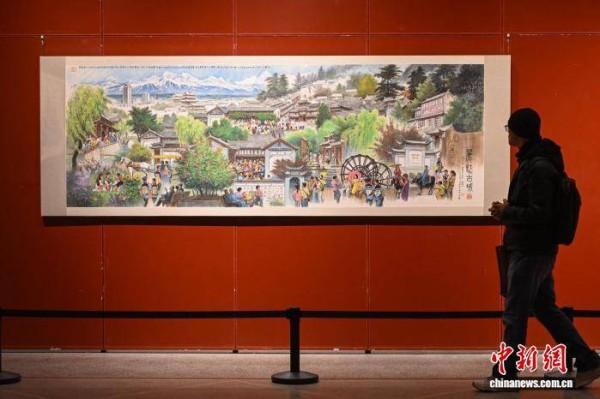1月9日,云南昆明,观众观看展品《丽江古城》。中新社记者 李嘉娴 摄