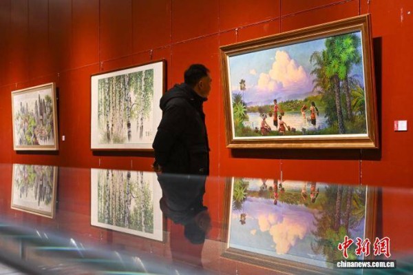 1月9日,云南昆明,观众观看展品《澜沧江暮色》。中新社记者 李嘉娴 摄