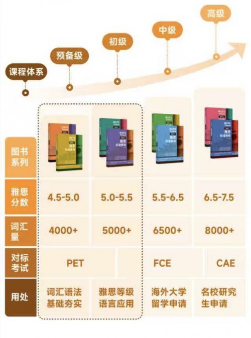 包含预备级、初级、中级、高级,对应雅思分数4.55.0、5.05.5、5.56.5、6.57.5,词汇量要求分别为4000+、5000+、6500+、8000+,对标考试依次为PET、FCE、CAE,学习目标涵盖国际中学申请、海外名校本科、说是申请、公务员考试、职场求职等不同阶段。