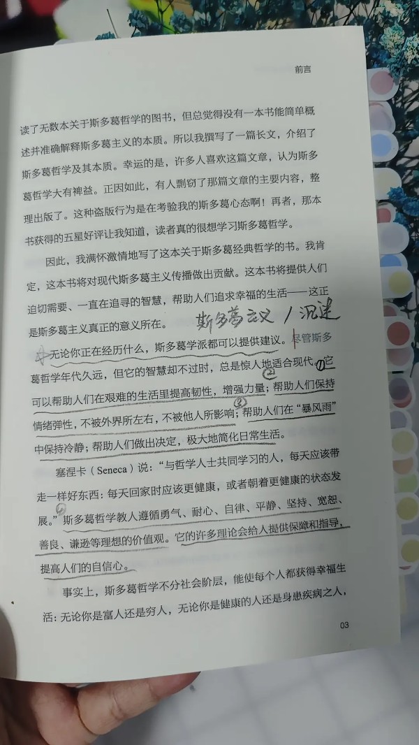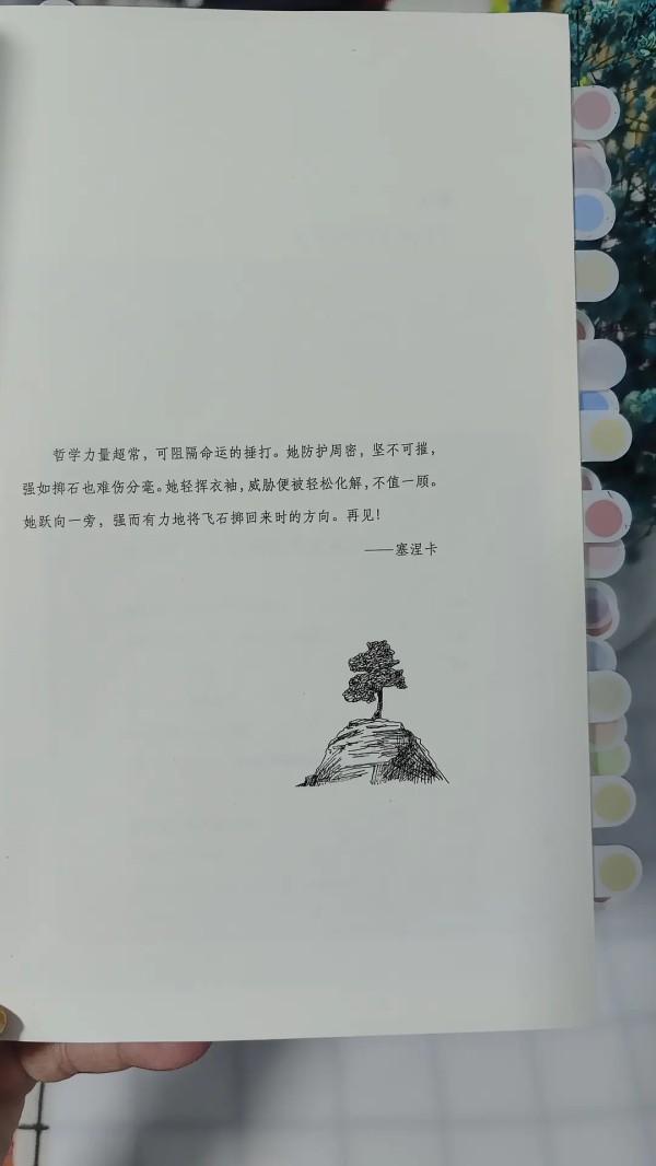 书名:《斯多葛 生活哲学》 作者:[瑞士]乔纳斯·萨尔茨格伯 出版:台海出版社 我们每个人都在追寻生命的意义,生活的真相,可真正的自我幸福是什么却难得体会到。《斯多葛 生活哲学》这本哲学理论书分为两部分:斯多葛哲学的概念和55条斯多葛训练。书中集结了古希腊的永恒智慧,是一本可以常读的现代生活实用指南。 你遇见的任何一件坏事情,都有可能是让你的内在优秀成长的好事情。我们国家有句古话:塞翁失马,焉知非福。斯多葛学派的创始人芝诺发生海难后,他的财产悉数沉没海底,这时的芝诺没有纵身一跃,而是重新思考了自己的人生,继而创立了芝诺学派,后又称斯多葛学派。 “每时每记得表达最高自我”这是斯多葛主义的核心精神,而不受控于情绪,就可以实现每时每刻表达最高自我。我们不得不说,哲学可匠心。 大多时候,我们大多数人,被旁人、旁事或者一些外部因素干扰,追求自己不能控制的,这其实是很愚蠢的行为。反观芝诺的人生经历,它让我们感受到了哲学的无穷力量。 芝诺这样告诉世人:遭遇海难后,我顺风顺水。这是多么难得的生命智慧,芝诺的亲身经历验证了一条正确的生活准则: 不要尝试去掌控外在环境,我们可以学会有效掌控我们的情绪,从而旋转你的命运开关。无论你是什么身份,都丝毫不影响你践行幸福的生活方式。 书中提及的四位哲学家,他们极具魅力的人生带给我们更多启迪:剧作家出身,事业干得风生水起,最后被暴君尼禄皇帝下令自缢的塞涅卡;建立学校传授斯多葛哲学、被尼禄流放希腊加罗斯岛的穆索尼乌斯·鲁弗斯,尼禄去世后他回到国家,七年后再次被流放;出身奴隶家庭,一条腿残疾的、鲁弗斯的学生爱比克泰德和罗马帝国五贤帝时代的最后一位帝王马克·奥勒留—— 他们的哲学思想一直流传至今,他们所讲到有关生活的哲思金句,像明亮的火把照亮了多少人迷茫的内心。 书中引用的伟大人物的真实事例,更加让我们看清了哲学的本质体现。比如:爱迪生在实验室发生大火后对儿子说:喊你的母亲和她的朋友们来,要不然她们再也看不到这样的大火了。看到这里,任谁绷着的心也会轻松释然。 合上这本书,我反思了一下自己的过去和现在,错失过许多生活中的小幸福。往后余生,我会以斯多葛主义明示的四项基本美德:智慧、正义、勇气和自律来去维系那个自己忽略的“幸福三角”,成就更真的自我。 金句摘抄: 生活是一张空白画布或是一块大理石,我们穷其一生,在上面练笔或雕刻,最终掌握了这门手艺。 幸福即顺遂的生活。 拥有聪慧善良的挚友是世界上最珍贵的外在事物之一。 爱比克泰德说:不在意自己无法掌控的东西就不会受苦。 如果你想成为最好的自己,就和最好的人来往。 ……