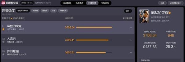猫眼专业版的榜单显示,《沉默的荣耀》排在第一,这部剧其实刚开始很多人以为就是传统谍战,结果剧情一展开,历史事件和人物信仰交织,情感浓烈,