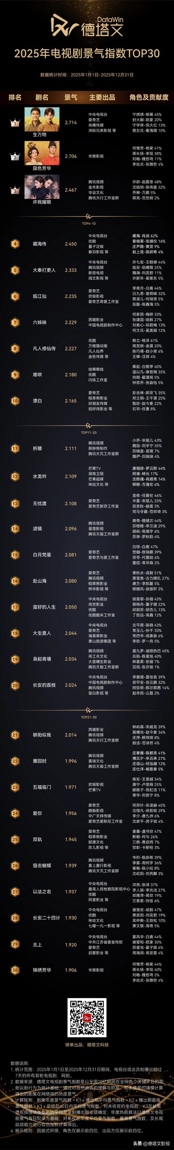德塔文对2025年度近300部首播的电视剧作品进行了综合评价梳理,并根据截至12月31日的数据,统计出了一年一度最受关注的剧集TOP30,即过去一年中最具泛社会影响力的作品。