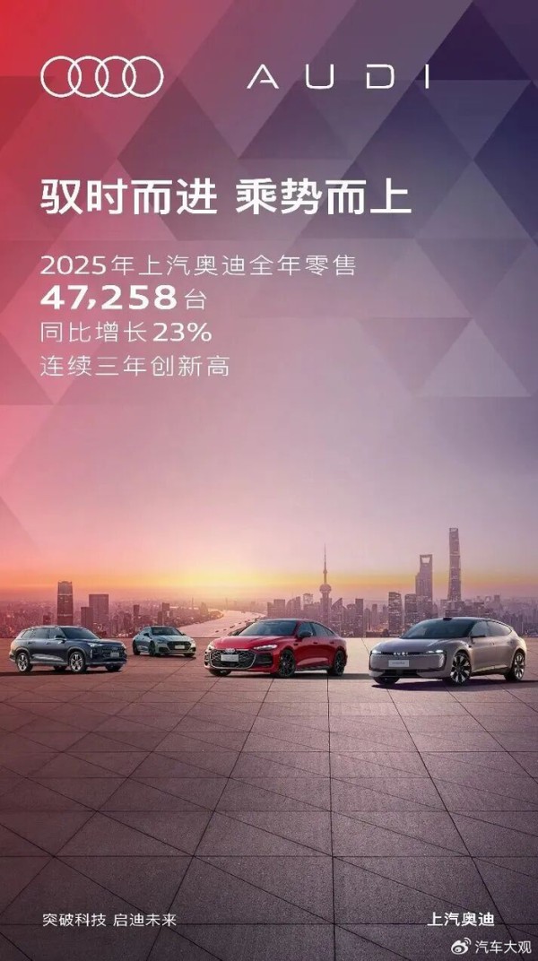 最新销量数据显示,上汽奥迪2025年全年零售达47,258台,同比增长23%,实现年度销量稳健三连涨,奥迪 E5 Sportback累计销量达6,650辆。