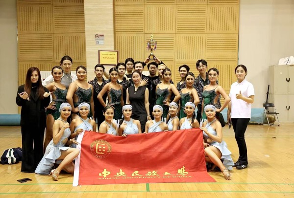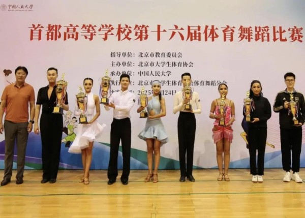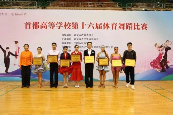 5 月 24 日,由北京市大学生体育协会主办、中国人民大学承办的第十六届首都高校体育舞蹈比赛在中国人民大学体育馆举行。本届比赛吸引来自北京大学、清华大学、北京体育大学、中央民族大学等三十余所高校的数百名选手同场竞技。我校体育舞蹈阳光组代表队27 名选手在教练员胡悦、段冠婷两位老师的带领下,最终荣获甲组团体总分第四名,并获得体育道德风尚奖殊荣。
