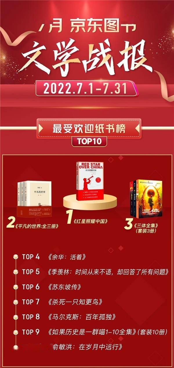 7月文学类榜单上大都是我们熟悉的常销书兼畅销书,《红星照耀中国》《活着》《平凡的世界》《三体》等始终站在排行榜的前列,而《杀死一只知更鸟》《百年孤独》也是外国文学的畅销书常客。季羡林《时间从来不语,却回答了所有问题》是散文畅销书的代表。林语堂的《苏东坡》和俞敏洪的《在岁月中远行》则是文化热点向图书领域的延伸。