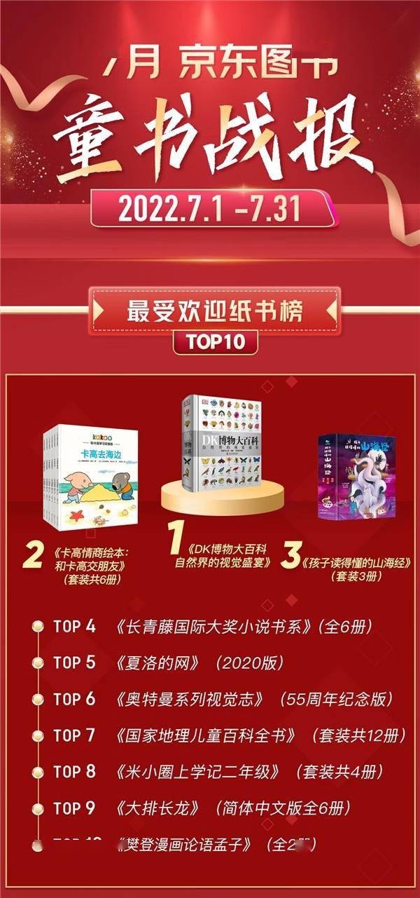 童书畅销榜反映出绘本和传统文化主题图书受到了更多孩子的欢迎。其中,除《DK博物大百科》稳居榜首外,《卡高情商绘本:和卡高交朋友》(套装共6册)以及《夏洛的网》(2020版)等图书在小读者心中的位置也不可小觑。《孩子读得懂的山海经》(套装3层)和《樊登漫画论语孟子》(全2册)等中国传统文化作品改编的读物受到孩子们的喜爱。《长春藤国际大奖小说书系》(全6册)《米小圈上学记二年级》(套装共4册)等文学类图书适合中小学生暑期阅读。