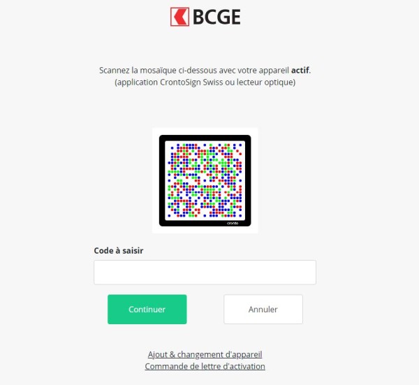 4- Ensuite, scannez la mosaïque de couleur à l’écran de votre ordinateur à l’aide de l’application CrontoSign Swiss sur votre téléphone ou de votre lecteur optique, et reportez le code dans la case « Code à saisir » et cliquez sur le bouton vert « Continuer ».