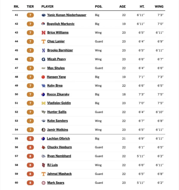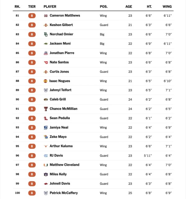最后说明:本指南可能在国际球员退出截止日后更新。目前排名50开外的国际球员均未列入,因其中许多人更倾向选择NCAA提供的丰厚合同。甚至部分因年满22岁自动获得参选资格的国际球员也在考虑大学路线。如有突发变动,我们将及时补充!