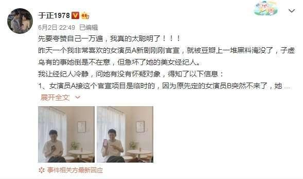 6月2日夜间,于正发布了一篇媒体动态,用ABCDE等字母代替了爆料内容当中出现的女明星及其经纪人的名字。这篇爆料简化一下讲,其实就是,有个女明星的经纪人,开黑另一位女明星,她们之间藏着“前朝旧恨”。