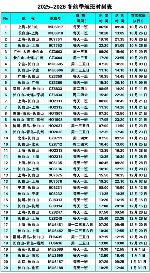 注:具体航班时刻请以航空公司当日航班计划为准。长白山机场问询电话:0439-6259111
