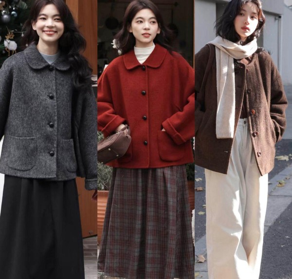 像下面这几款大衣,都是偏短的款式,整体的设计是特别的简单的,大家可以运用长裙或者是长裤进行配合,可以将身材比例进行修饰。