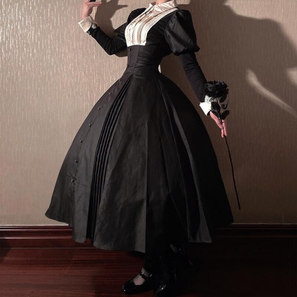 哥特文化爱好者一定会被这款重工洛丽塔连衣裙吸引。上衣与半裙的分体式设计打破了传统洛丽塔服饰的单一感,黑色蕾丝与缎面的材质碰撞营造出华丽而神秘的氛围。