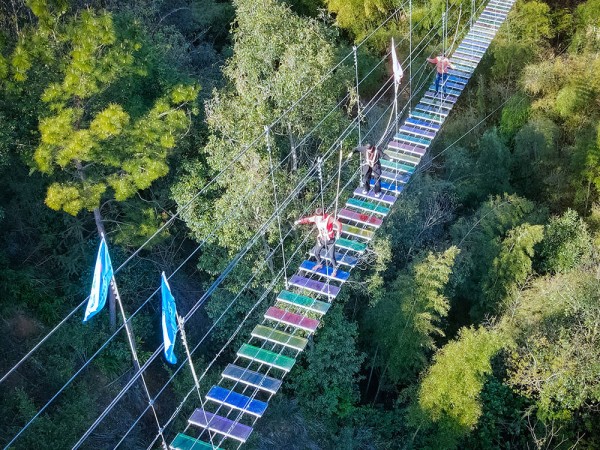 灵龙谷景区的特点也十分显著。它既有刺激体验与游乐项目,又有亲子休闲与萌趣体验,还有多种住宿服务可供选择。在刺激体验项目方面,步步惊心玻璃桥全长近200米,踏板之间有间隙,让游客体验惊险刺激又有惊无险的感觉;悬崖秋千能让游客佩戴保险设备后荡向山间,感受一飞冲天的刺激并换角度欣赏美景;高空滑索全长230多米,落差20多米,游客可以从山峰一路滑至谷底,体验风驰电掣的速度,同时在高空欣赏峡谷景色;激速漂流(彩虹水滑道)是极具特色的森林高空水滑漂流,全长420米,垂直高度115米,两人一组乘坐橡皮艇,在水流冲击下沿滑道滑下山谷,体验速度与激情。此外,丛林探险、童趣旱滑、旋转秋千、蒙古射箭、网红摇摆桥、拓展攀岩等项目也各有特色,能让游客充分释放压力,享受刺激与乐趣。