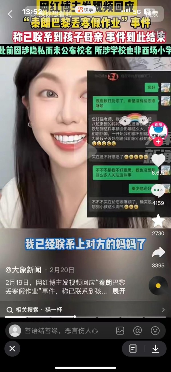 4月12日晚,杭州警方通报:“秦朗寒假作业丢巴黎”事件系策划编造。涉案两人 自编视频脚本,网购寒假作业,用手机自拍、制作相关视频,并散播至多个网络平台,造成恶劣影响。目前,公安机关已依法对涉案人员及其所在公司作出行政处罚。