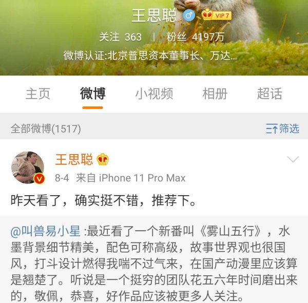 另外,《雾山五行》这一部国产动漫新作,还得到了王思聪的推荐,至于王思聪是谁,想必大家都知道了吧!他就是那个有名的“王校长”,还有他就是那个所谓有钱的“土豪”。因此可见他是一个挺有名气的人了,而《雾山五行》能够得到这么一个大人物的认可与推荐,意味着《雾山五行》是非常的可以的了。
