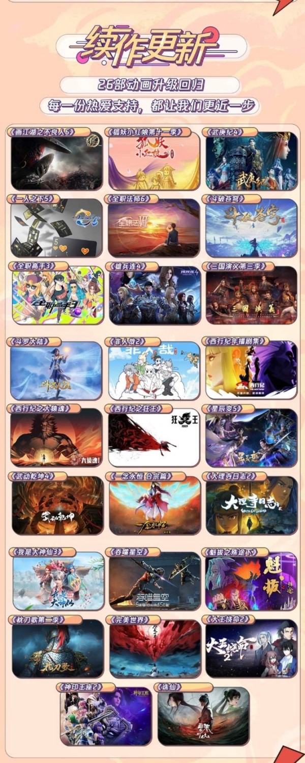 与此同时,重点IP续作还有万众期待的西行纪IP系列《西行纪之大猿魂》《西行纪之狂王》,立足传统又拥有创新设定的故事将继续展开。由同名电竞小说改编的《全职高手》第三季也将上线。集搞笑、断案、权谋等元素于一身的高人气黑马国漫《大理寺日志》,第二季将在不久后亮相。《枕刀歌第2季》也将上新,以淳厚武侠风讲述江湖故事,延续豪情与义气。还有刚刚开播的《诛仙》,以及《狐妖小红娘第11季》《画江湖之不良人第6季》《一人之下第5季》《魁拔之殊途下》等经典IP续作也将不断上线和更新。