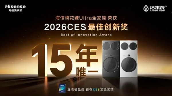 展会期间颁发了CES创新奖,海信棉花糖Ultra全家筒洗衣机获得CES 2026最佳创新奖,成为近15年来全球洗衣机品类唯一获得该奖项的品牌。