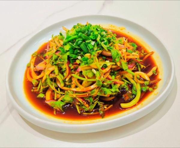 洋葱切丝,加入香菜、小米辣椒及调味料,拌匀入味。