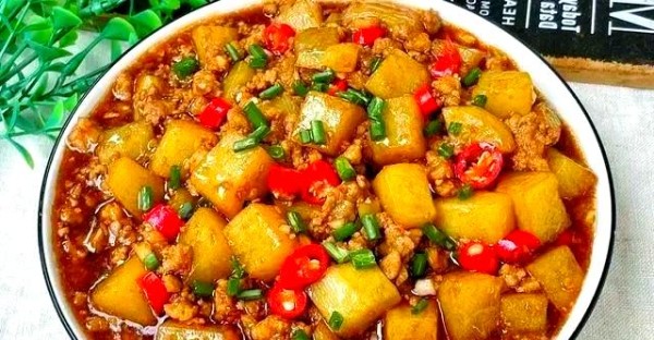 土豆切块煎至黄,肉末炒变色,葱、蒜、小米辣调味。