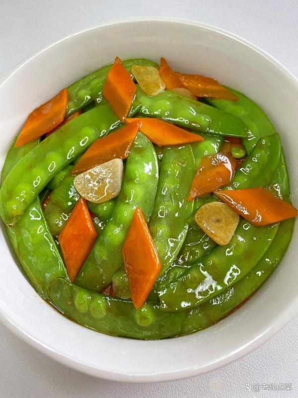 热锅倒油,放入蒜末爆香,先加入胡萝卜片翻炒 1 分钟,再加入荷兰豆和玉米笋大火翻炒。