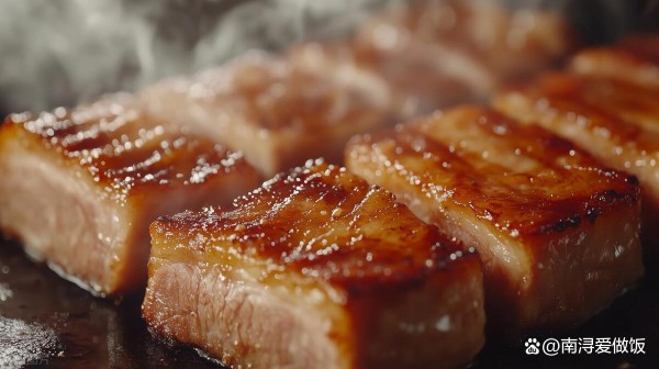 (2) 煎五花肉时要保持中小火,这样才能保证五花肉的油脂逐渐渗出,而不至于过于焦硬。
