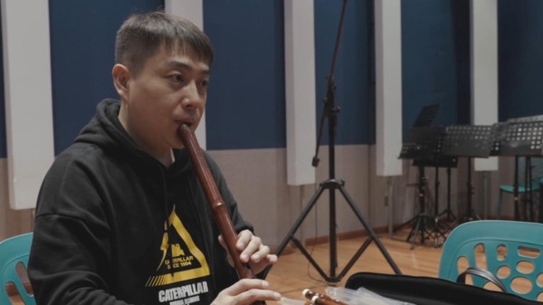 音乐工作室音乐人正在吹奏箫。新华社发 音乐创作团队选择了弦乐与合唱,营造恢宏的气势,还加入了中国传统乐器箫,来体现父爱的温润细腻。