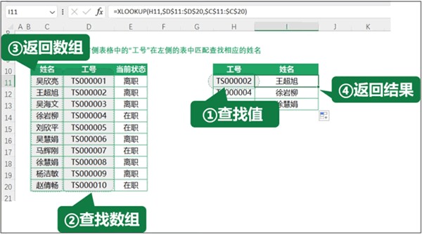 右侧表需要查找的是“工号”,返回“姓名”列;而“工号”在左侧表中是第 2 列,“姓名”在第 1 列,明显不能使用 VLOOKUP() 函数,因为 VLOOKUP() 函数要求查找列必须为查找范围的第 1 列,而使用 XLOOKUP() 函数就能很好地解决这个问题。
