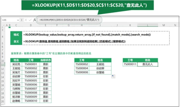 =XLOOKUP(K11,$D$11:$D$20,$C$11:$C$20,"查无此人")