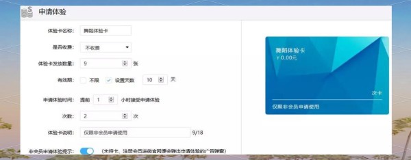 在菲特云系统中,场馆管理员可以在“体验卡设置”功能里,详细制定体验卡的使用规则。这些规则涵盖了费用、数量、使用次数以及预约时间等多个方面,从而为课程体验提供了更加规范、全面的管理。