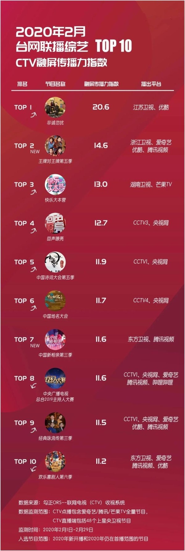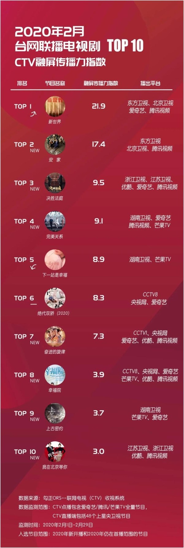 对比1月榜单可以发现(1月榜单在这里:“融屏之战”,一触即发),榜单TOP2节目均采用了"北京卫视+东方卫视+头部平台"的播出模式。两大拥有高粘性受众的卫视频道强强联手,融合头部平台的高流量,赋能品质剧,最大化剧集收视,堪称"王炸"。