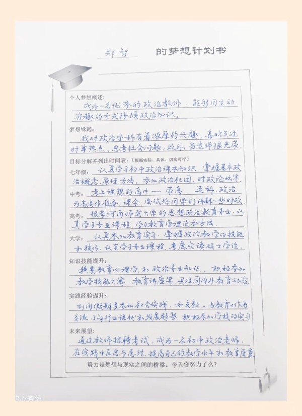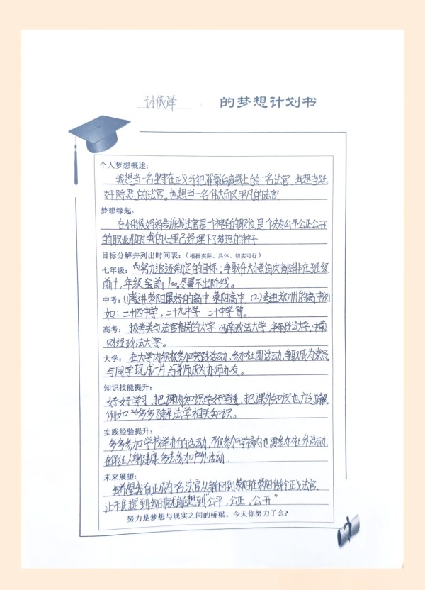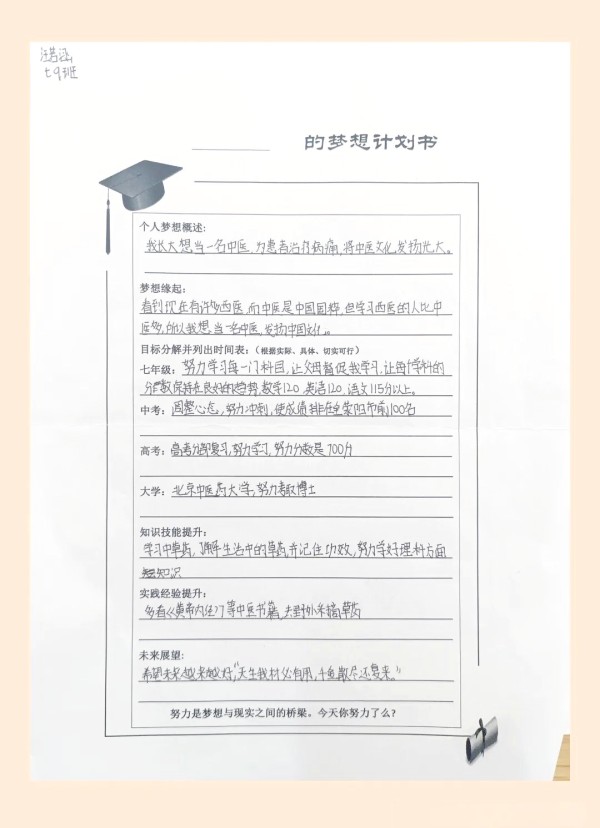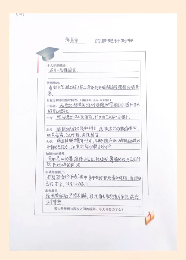 此外,梦想的实现往往受到多种因素的影响,包括内在和外在的挑战。因此,在制定行动计划书时,教师需要引导学生进行全面的、多维度思考。通过师生间、生生间的交流与启发,学生能够更深入地思考问题,使行动计划书的内容更加全面、丰富。