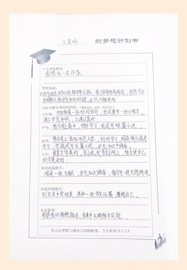 在撰写行动计划书时,学生应确保梦想的具体性,因为越具体的梦想越能引导他们写出切实可行的方法。避免选择过于宏观或庞大的梦想,这样不仅难以实现,还会削弱学生的积极性和动力。若学生的梦想确实过于宏大,教师可以协助其进行拆分,使其更具体、更可实现。通过这种方式,学生在逐步实现更具现实性的梦想的过程中,能够不断积累成就感与掌控感,从而取得更大的成就。