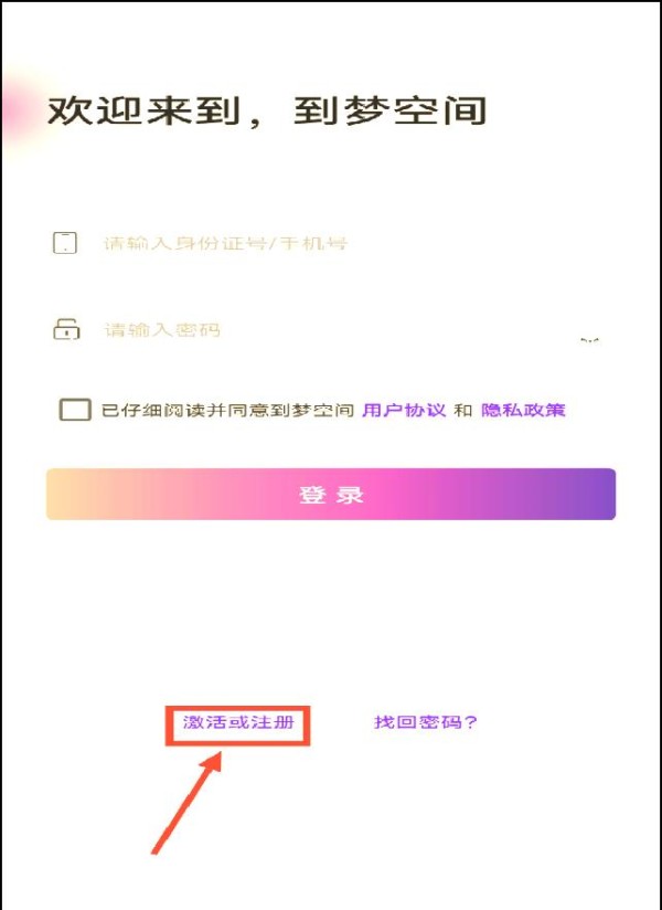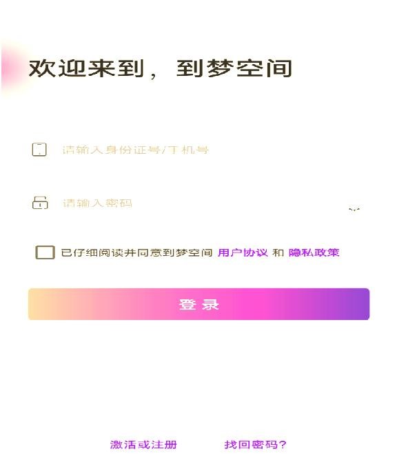 (1)下载并安装“到梦空间”应用程序,打开后选择激活或注册账号。