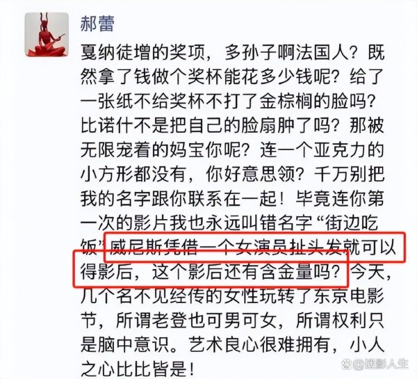 就在这时候,郝蕾又跳了出来,在朋友圈发了一篇长文,扫射了一大片人,暗指现在的国内外电影节都可以暗箱操作,包括戛纳、威尼斯、东京。