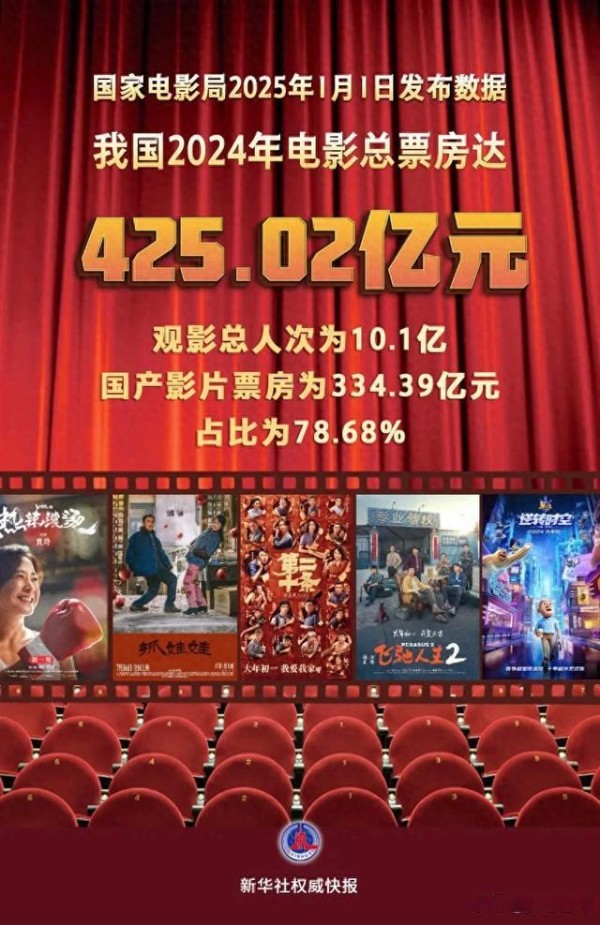 国家电影局1月1日发布数据,我国2024年电影总票房达425.02亿元,观影总人次为10.1亿。其中,国产影片票房为334.39亿元,占比为78.68%。