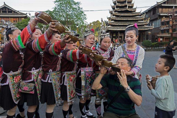 客人来了以美酒相待,是一种神圣而不可改变的待客礼节。你如果来到了苗寨,苗族人加会拿出自家亲自酿制的各种酒来款待你,说明你是他们的贵宾(会被他们的“热情”灌醉)。开席,不得先端饭碗,而是先把酒喝够。首先是由主人给每个人斟酒,各自喝两杯。其次由主人给大家敬酒,也是每人须敬两杯。在敬过酒后,大家就可以吃饭了。