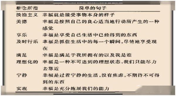 由此可见,人们的对于幸福有各种不同的理解和阐释, 内外部条件与主观感受构成了我们的幸福观和幸福感。