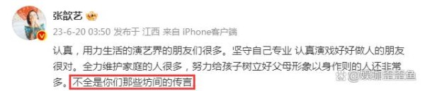 张歆艺以自己为例称“坚守自己专业、认真演戏、好好做人的朋友很多,全力维护家庭、努力给孩子树立好父母形象、以身作则的人很多,认真、用力生活的演艺界的朋友们很多”。二姐的这番发声,言外之意演艺圈其实有坏人也有好人,切勿以偏概全,多一份正能量与善良。