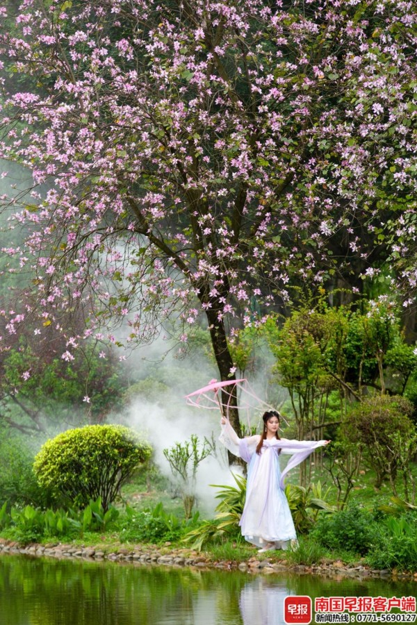 穿着古装的女子在柳州市市民广场的水边,与紫荆花合影。广西云-南国早报记者 邹财麟 摄