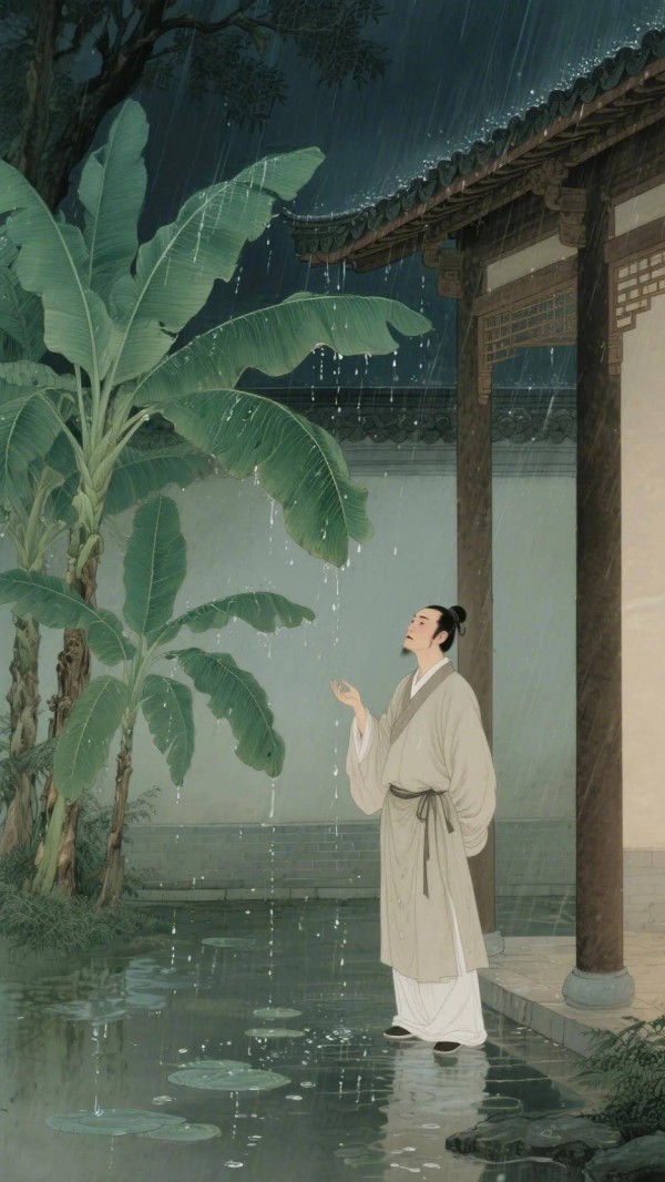 张嵲的这场夜雨,是一场纯粹的听觉盛宴,也是一场情感的深度体验。从模糊的“夜雨声”,到清晰的“空阶滴沥”,再到刻意追寻的“芭蕉叶上”声,雨声越来越具体,诗人的愁绪也越来越浓重。这雨,是孤独的催化剂,是愁绪的放大器,它将诗人天涯飘零的悲苦,渲染得凄婉动人,令人不忍卒读。